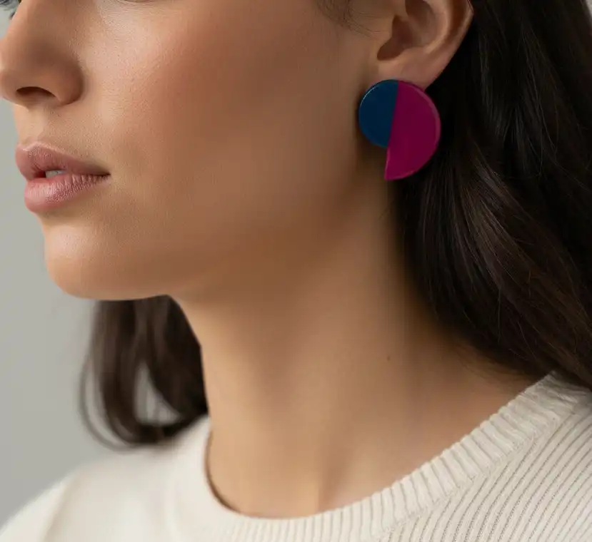 Questi orecchini a lobo grandi artigianali sono composti da un elemento a semicerchio fucsia che abbraccia un semicerchio blu, creando un effetto tridimensionale magnetico.